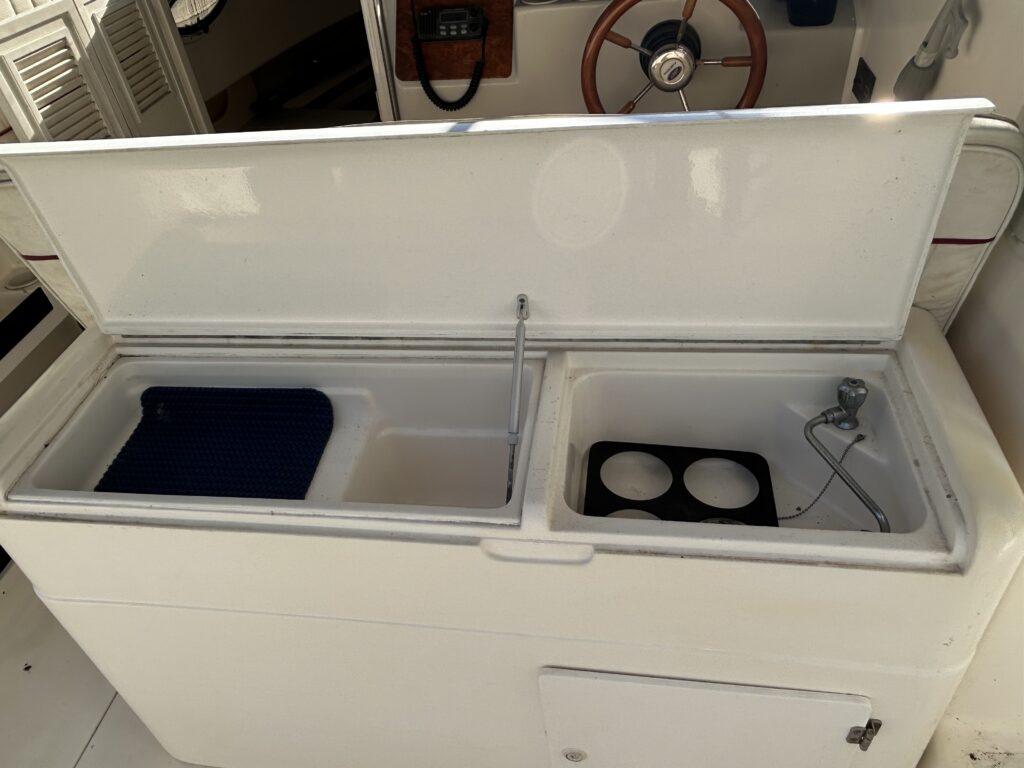 La cubierta walkaround permite moverse con facilidad por todo el barco, aportando seguridad en maniobras y comodidad en fondeo o pesca. Dispone de una amplia bañera, ideal para disfrutar del mar, así como zonas de solárium y espacios bien aprovechados para el ocio a bordo.